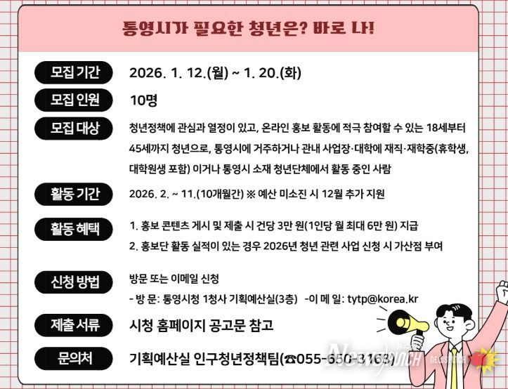 아울러 홍보단 활동 실적이 있는 참여자에게는 2026년 통영시 청년정책협의체, 청년동아리 지원사업, 청년축제자문단 3가지의 청년 관련 사업 신청 시 가산점이 부여될 예정이다.