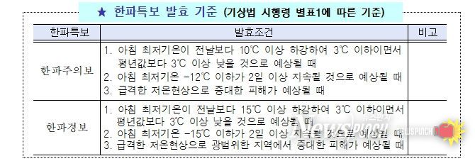 한파특보 중 ‘한파주의보’는 아침 최저기온이 전날보다 10℃ 이상 하강하여 3℃ 이하이면서 평년값보다 3℃ 이상 낮을 것으로 예상되거나 아침 최저기온이 전날보다 12℃ 이하인 날이 2일 이상 지속될 것으로 예상될 때 발효된다.