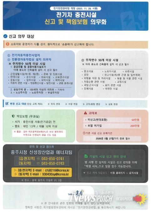 뉴스펀치 이현승 기자 | 충주시는 '전기안전관리법'개정에 따라 전기자동차 충전시설 설치 및 변경 시 지자체에 사전 신고하도록 하는 ‘전기차 충전시설 신고제도’ 를 시행한다고 12일 밝혔다.