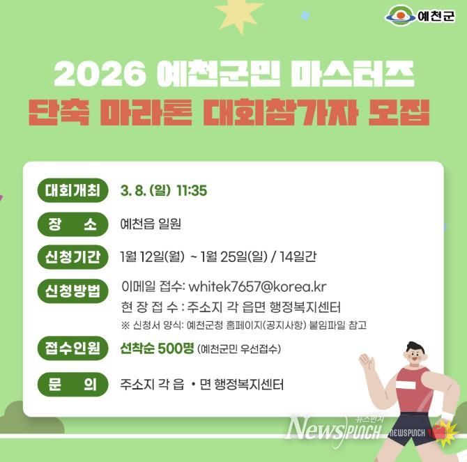 뉴스펀치 박세훈 기자 | 예천군은 오는 3월 8일 개최되는'2026 예천군민 마스터즈 단축 마라톤 대회' 참가자 모집을 12일부터 25일까지 2주간 진행한다고 밝혔다.