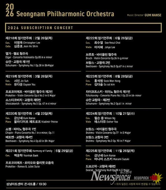 뉴스펀치 박상훈 기자 | 2026년 창단 23주년을 맞는 성남시립교향악단은 해마다 다양한 연주자와 수준높은 프로그램으로 끊임없이 매진 행렬을 이어가고 있다.