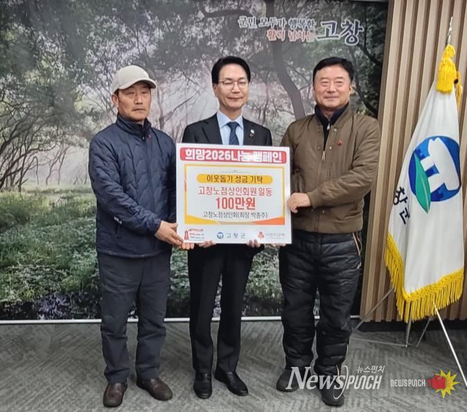 뉴스펀치 정홍균 기자 | 고창노점상인회가 지난 9일 고창군청을 방문해 지역 내 어려운 이웃을 돕기 위한 성금 100만원을 기탁했다.