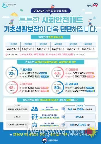 2026년도 기준중위소득은 4인가구 기준 6.51%로 역대 최대 인상되며, 기초생계급여 지원액도 4인가구 기준 195만 1,287원에서 최대 207만 8,320원으로 인상 지원한다.
