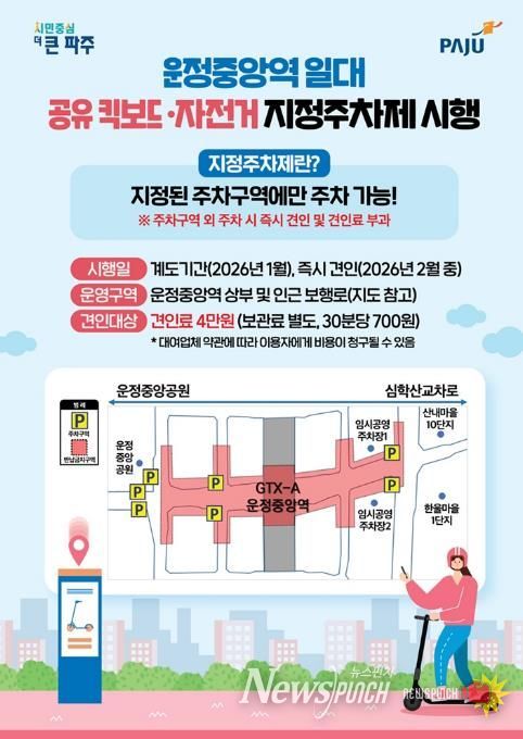 뉴스펀치 박상훈 기자 | 파주시는 운정중앙역 일대의 보행자 안전을 확보하고 공유 이동장치의 무분별한 방치를 해소하기 위해 운정중앙역 상부와 인근 보행로를 대상으로 공유 이동장치 ‘지정주차제’를 시행한다고 12일 밝혔다.