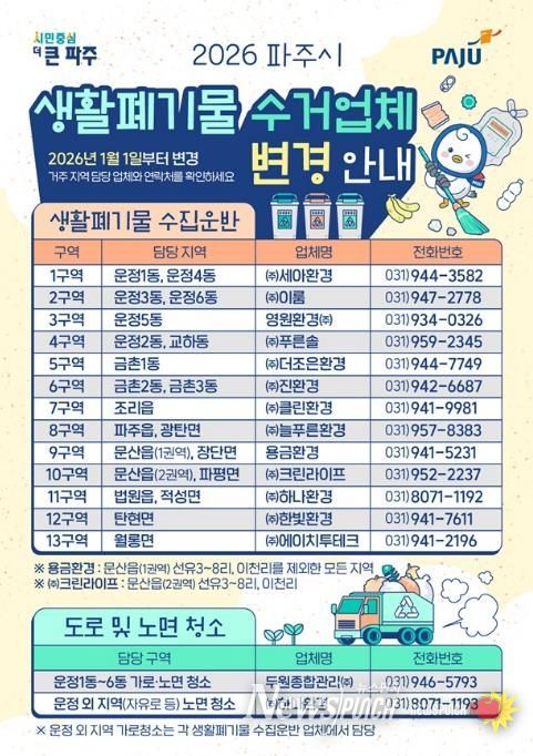뉴스펀치 박상훈 기자 | 파주시는 2026년 1월 1일부터 관내 생활폐기물(쓰레기) 수집·운반 대행업체가 변경됨에 따라, 시민에게 정확한 정보를 안내하고 현장 운영이 원활히 정착될 수 있도록 홍보와 안내를 강화하고 있다고 밝혔다.