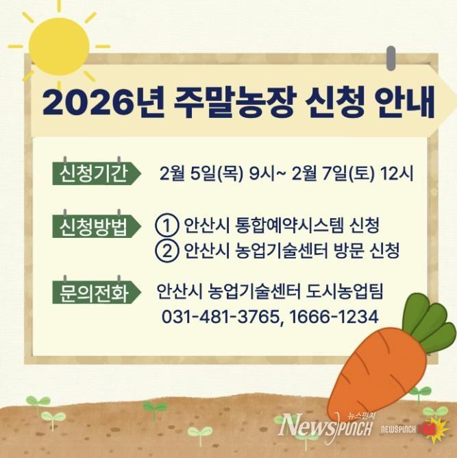 이민근 안산시장은 “주말농장은 가족이 함께 흙을 만지며 건강한 여가를 보낼 수 있는 도심 속 농업 공간”이라며 “시민들이 일상 속 자연과 교감할 수 있는 기회인 만큼, 많은 시민 분들의 참여를 기대한다”고 말했다.