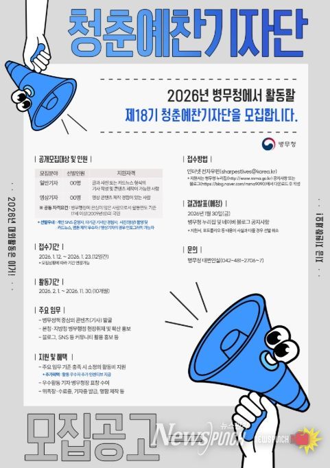 뉴스펀치 정홍균 기자 | 병무청은 2026년에 활동할 제18기 청춘예찬기자단을 2026년 1월 12일부터 1월 23일까지 공개 모집한다.