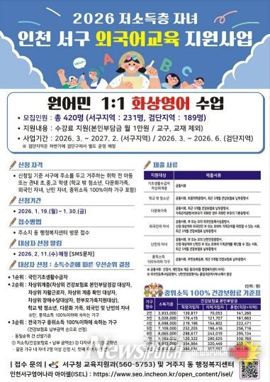 뉴스펀치 정홍균 기자 | 인천 서구는 저소득층 자녀에게 양질의 외국어 교육을 지원함으로써 교육 기회의 형평성을 제고하고 글로벌 시대에 걸맞는 인재로 성장할 수 있는 기반을 마련하고자 관내 저소득층 자녀를 위한 외국어교육 지원 사업을 3월부터 시행한다.