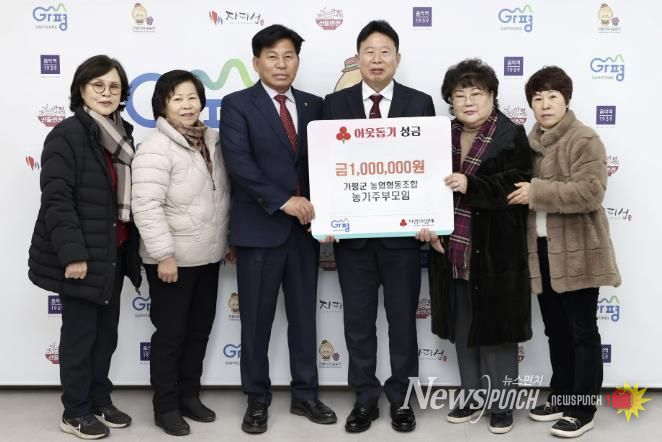 뉴스펀치 박상훈 기자 | 가평군농협 농가주부모임은 9일 가평군청에서 서태원 군수, 장동규 조합장 등과 함께 이웃돕기 성금 전달식을 갖고 성금 100만원을 기탁했다.