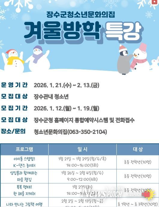 뉴스펀치 정홍균 기자 | 장수군은 오는 21일부터 다음달 13일까지 지역 청소년들을 대상으로 방학 기간을 보다 의미 있게 보낼 수 있도록 장수군청소년문화의집에서 다양한 겨울방학 특강 프로그램을 운영한다.