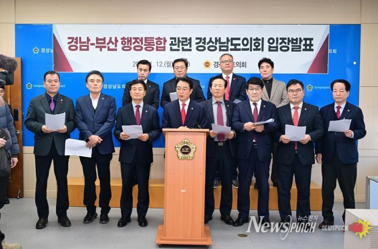 뉴스펀치 박세훈 기자 | 경상남도의회는 1월 12일, 도의회 브리핑룸에서 기자회견을 열고, 현재 추진 중인 경남·부산 행정통합 논의와 관련해 통합의 방향성에는 공감하되, 성급한 추진에 대해서는 신중한 접근이 필요하다는 공식 입장을 밝혔다.