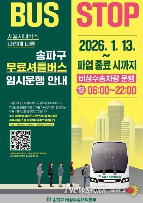 뉴스펀치 박상훈 기자 | 송파구는 서울시버스노동조합이 오는 13일부터 총파업 돌입을 예고함에 따라 구민들의 교통 불편 최소화를 위해 무료 셔틀버스를 투입하는 등 '비상수송대책'을 가동한다고 밝혔다.