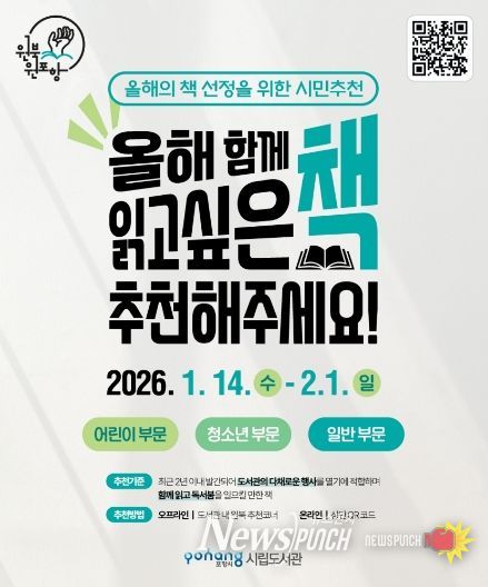 뉴스펀치 박세훈 기자 | 포항시는 ‘2026년 포항시 올해의 책’을 선정하기 위해 오는 14일부터 내달 1일까지 후보 도서를 추천받는다.