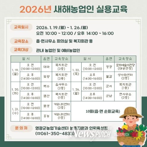 뉴스펀치 김용희 기자 | 영광군은 오는 1월 19일부터 26일까지 각 읍·면에서 농업인 1,800명을 대상으로 “2026년 새해 농업인 실용교육”을 실시한다고 밝혔다.