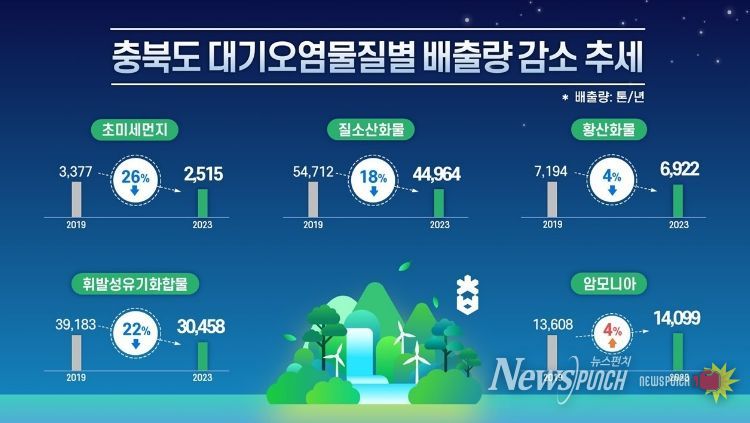 뉴스펀치 이현승 기자 | 충북도는 ’23년 대기오염물질 배출량이 `19년 대비 큰 폭으로 감소했다고 밝혔다.