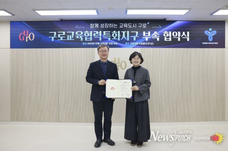 뉴스펀치 박상훈 기자 | 구로구가 1월 12일 구청 소통홀에서 서울특별시남부교육지원청과 ‘구로교육협력특화지구 부속 합의 협약식’을 열고, 학생맞춤통합지원 협력사업을 포함한 구로교육특화지구 교육협력 사업 추진을 위한 부속합의를 체결했다.