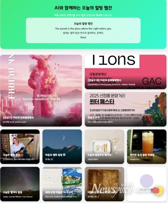 조성명 강남구청장은 “AI 힐링 웹진은 기술과 감성이 조화롭게 어우러진 강남구 디지털 혁신의 대표 사례”라고 평하며, “앞으로도 구민들이 언제 어디서든 따뜻한 위로와 재충전의 시간을 가질 수 있도록 차별화된 온·오프라인 힐링 콘텐츠를 지속적으로 발굴해 나가겠다”고 밝혔다.