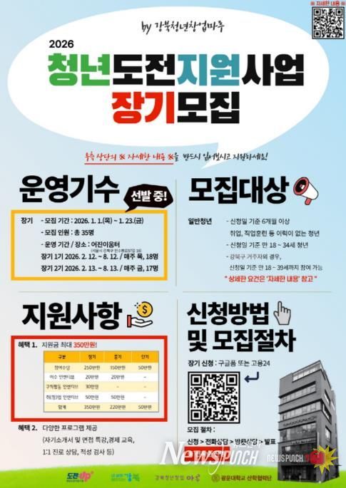 뉴스펀치 박상훈 기자 | 서울 강북구는 강북청년창업마루가 구직을 단념했거나 취업 준비에 어려움을 겪고 있는 청년을 대상으로 ‘2026년 청년도전지원사업’ 장기 프로그램 참여자를 모집한다고 밝혔다.