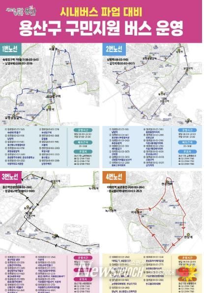 용산구 관계자는 “시내버스 파업으로 교통 혼잡과 이동 불편이 발생하고 있는 만큼, 마을버스와 지하철 이용, 승용차 함께 타기 등 교통 수요 분산에 구민 여러분의 적극적인 협조를 부탁드린다”라고 말했다.