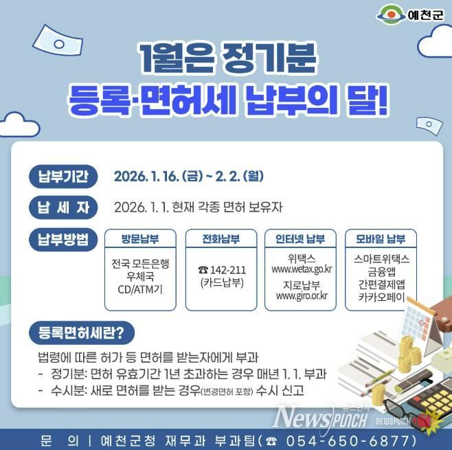 뉴스펀치 박세훈 기자 | 예천군은 정기분 등록면허세 13,922건, 1억 9천8백만 원을 부과했다고 13일 밝혔다.