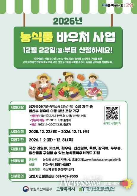 뉴스펀치 박상훈 기자 | 고양특례시는 올해부터 지역 내 취약계층의 균형 잡힌 식생활을 지원하고, 농식품 소비 촉진을 돕기 위해 ‘농식품 바우처 사업'을 확대 시행한다고 13일 밝혔다.