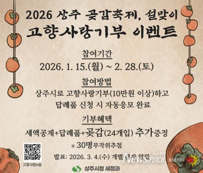 뉴스펀치 박세훈 기자 | 상주시는 2026 상주곶감축제 및 설 명절을 맞이하여 1월 15일부터 2월 말까지 고향사랑기부 이벤트를 실시한다.