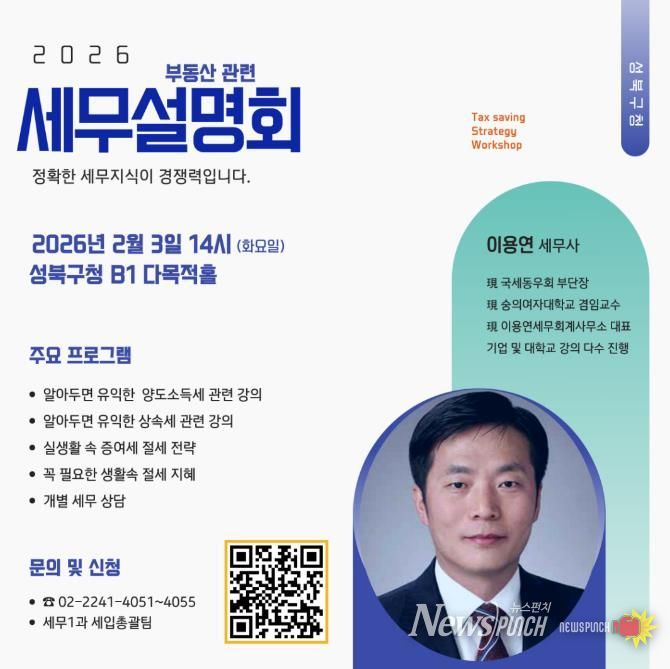 2월 3일 성북구청 지하1층 다목적홀에서 '2026년 부동산관련 세무 설명회'로 부동산 세금에 관심 있는 구민 250명을 선착순으로 모집해 진행한다.