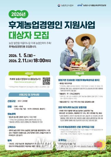 신청은 오는 2월 11일 오후 6시까지 차세대 농림사업정보시스템인 ‘농업e지’를 통해 온라인으로 접수하면 되며, 사업 관련 세부 사항은 농업e지 누리집에서 확인할 수 있다.