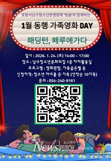 뉴스펀치 박세훈 기자 | 포항시청소년재단 남구청소년문화의집에서는 오는 24일 청소년 및 남구 지역 주민들을 위한 1월 동행 프로그램 ‘가족 영화 DAY’의 참가자를 모집한다.
