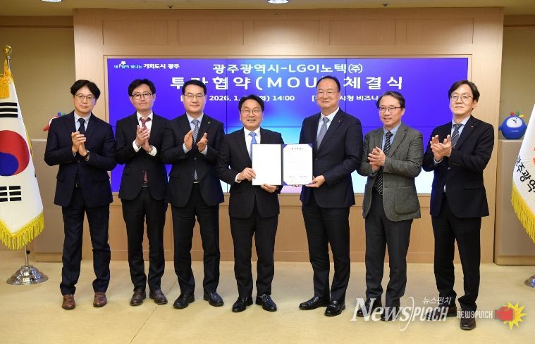 뉴스펀치 김용희 기자 | 광주광역시와 LG이노텍은 13일 시청 비즈니스룸에서 ‘차량용 제어모듈 신규 생산라인 구축을 위한 투자협약’을 체결했다. 이번 협약은 2026년 새해 부강한 광주로의 힘찬 도약을 알리는 첫 신호탄이다.