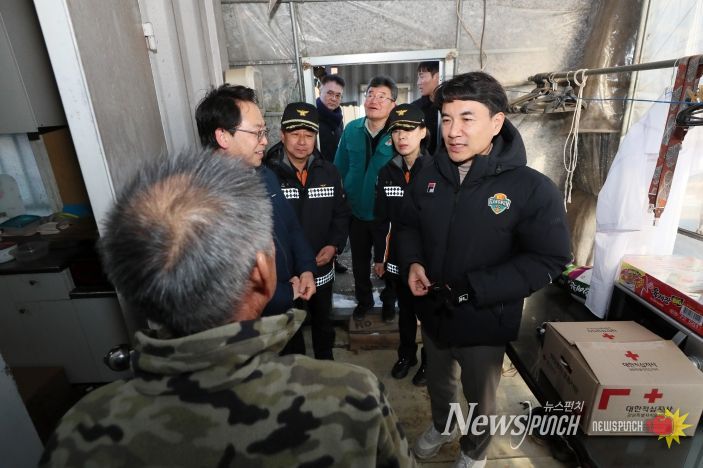 이날 김진태 지사는 겨울철 폭설로 인한 주거용 비닐하우스 붕괴 위험 여부를 점검하고, 거주지 내 난방기기와 소화기 작동상태 등 화재 예방을 위한 안전 점검을 실시했다.