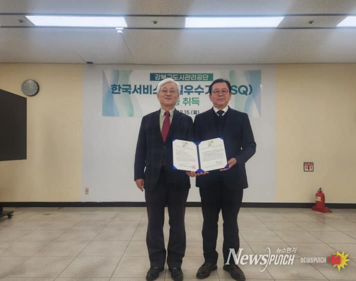 뉴스펀치 박상훈 기자 | 서울 강북구도시관리공단은 지난해 12월 한국서비스진흥협회로부터 한국서비스품질우수기관(SQ) 인증을 획득했다고 14일 밝혔다.
