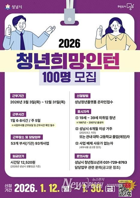 뉴스펀치 박상훈 기자 | 성남시는 오는 1월 30일까지 ‘청년 희망 인턴 사업’ 참여자 100명을 모집한다.