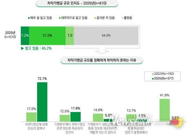 가맹본부의 53%가 차액가맹금이 존재한다고 응답했으며, 평균 금액은 연간 224만 원으로 조사됐다. 가맹점주를 대상으로 한 조사에서 차액가맹금의 규모를 알고 있는 응답자는 45.2%에 불과했으며, 정확하게 파악하지 못하는 이유에 대해 차액가맹금에 대한 무관심이 72.1%로 가장 높게 나타났다.