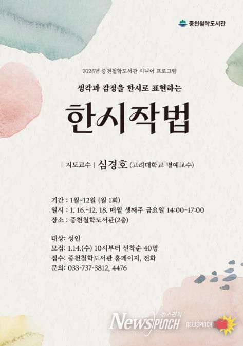 뉴스펀치 조평훈 기자 | 원주시 중천철학도서관은 어르신을 위한 인문 프로그램으로 한시를 통해 생각과 감정을 표현하는 ‘한시작법’ 강좌를 운영한다.