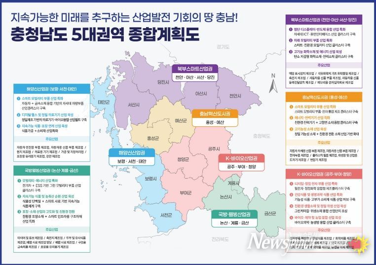 이에 따라 연구는 충남을 ▲북부스마트산업권 ▲해양신산업권 ▲충남혁신도시권 ▲국방·웰빙산업권 ▲K-바이오산업권 등 5대 권역으로 구분했다.
