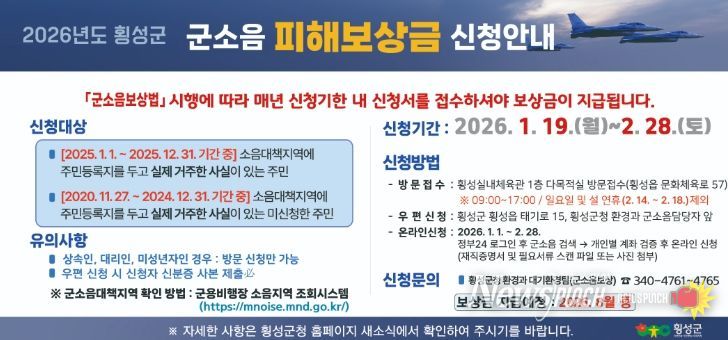 뉴스펀치 조평훈 기자 | 횡성군은 오는 19일부터 내달 28일까지 ‘2026년 군용기 소음피해 보상금’ 신청을 접수한다고 밝혔다.