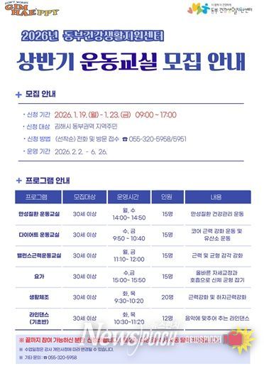 뉴스펀치 박세훈 기자 | 김해시 동부건강생활지원센터는 지역주민의 만성질환예방 및 건강증진을 위해 19일부터 1월 23일까지 '26년 상반기 운동교실' 참여자를 모집한다고 밝혔다.