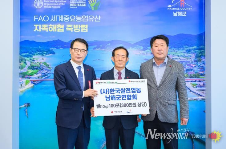 뉴스펀치 박세훈 기자 | 남해군은 지난 13일 (사)한국쌀전업농 남해군연합회와 장항동횟집이 이웃돕기 성금을 기탁했다고 밝혔다.