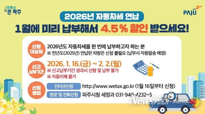 뉴스펀치 박상훈 기자 | 파주시는 2026년도 자동차세를 1월에 한 번에 납부하는 경우 세액공제 혜택을 받을 수 있는 자동차세 연납 신청·납부를 2월 2일까지 접수한다고 밝혔다.