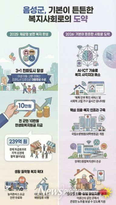 뉴스펀치 이현승 기자 | 음성군이 지난해 소외 계층 없는 ‘포용적 복지 도시’를 완성한 데 이어, 올해는 군민의 삶을 세심하게 살피는 ‘기본이 튼튼한 사회’로 질적 도약을 예고했다.