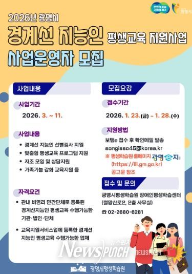 뉴스펀치 박상훈 기자 | 광명시는 ‘2026년 광명시 경계선지능인 평생교육 운영 지원사업’을 수행할 보조사업자를 오는 28일까지 공개 모집한다.
