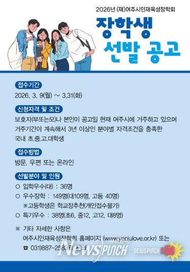 뉴스펀치 박상훈 기자 | (재)여주시인재육성장학회는 ‘2026년 여주시인재육성장학회 장학생 선발공고’를 여주시인재육성장학회 홈페이지 및 여주시청 홈페이지에 게시했다