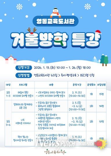 뉴스펀치 이현승 기자 | 영동교육도서관은 겨울방학을 맞아 초등학생을 대상으로 겨울방학 특강과 겨울 독서교실을 운영한다. 방학 중 학습 공백을 완화하고 건전한 여가 활용 기회를 제공하기 위함이다.