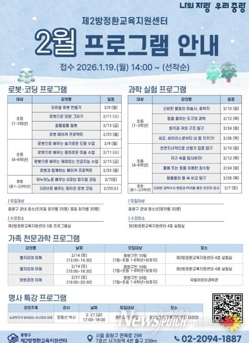 2월 겨울방학 특강은 로봇·코딩 프로그램과 과학 실험 프로그램을 중심으로 운영되며, 가족이 함께 참여하는 천문과학 프로그램을 포함해 구성됐다. 특히 천문과학 프로그램은 국립어린이과학관을 방문해 가족이 함께 전시와 체험 활동에 참여하는 방식으로 운영돼, 보다 생생한 과학 학습 경험을 제공할 예정이다. 2월 프로그램은 1월 19일부터 제2방정환교육지원센터 누리집을 통해 온라인 선착순 접수를 진행한다.