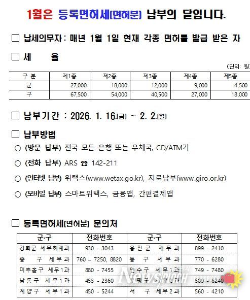뉴스펀치 정홍균 기자 | 인천광역시는 2026년 정기분 등록면허세(면허분) 396,262건, 총128억 원을 부과·고지했다고 밝혔다.