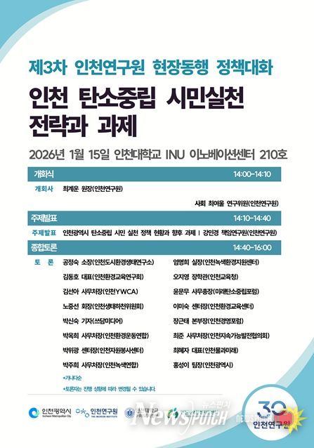 뉴스펀치 정홍균 기자 | 인천연구원은 인천대학교 RISE사업단, 인천녹색환경지원센터와 함께 1월 15일 오후 2시, 인천대학교 INU 이노베이션센터 210호에서 정책토론회를 공동 개최한다.