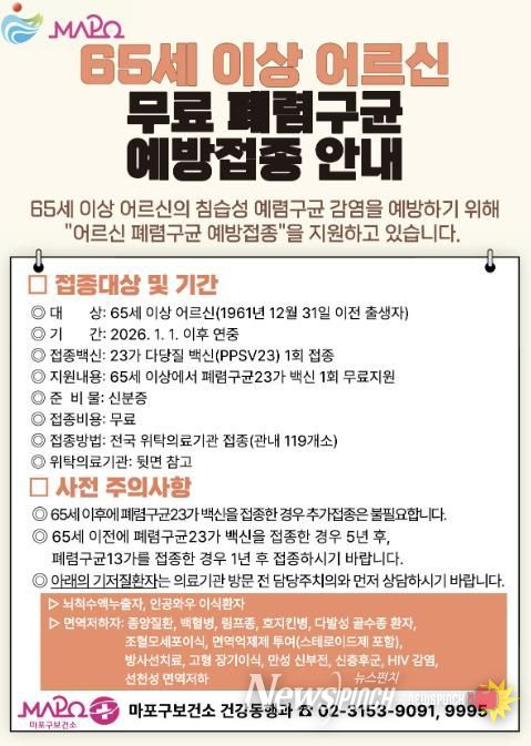 뉴스펀치 박상훈 기자 | 마포구는 65세 이상 어르신의 침습성 폐렴구균 감염을 예방하고 건강한 노후를 지원하기 위해 연중 ‘어르신 폐렴구균 예방접종’을 1회 무료로 실시한다.
