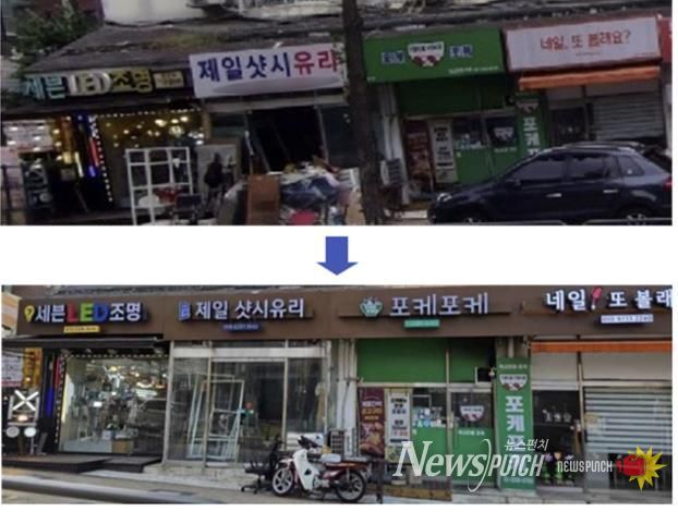 이를 바탕으로 12월 말까지 점포당 최대 300만 원을 지원해 총 51개 업소의 간판을 정비했으며, 보행에 지장을 주던 돌출 간판 44개를 철거했다.