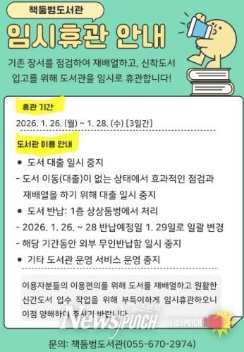 뉴스펀치 박세훈 기자 | 고성군이 운영하는 책둠벙도서관은 신규 장서 확충과 기존 장서 정비를 위해 2026년 1월 26일부터 28일까지 3일간 임시 휴관한다.